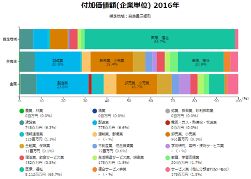 県・全国平均と比べると、医療・福祉、教育・学習支援が多め。