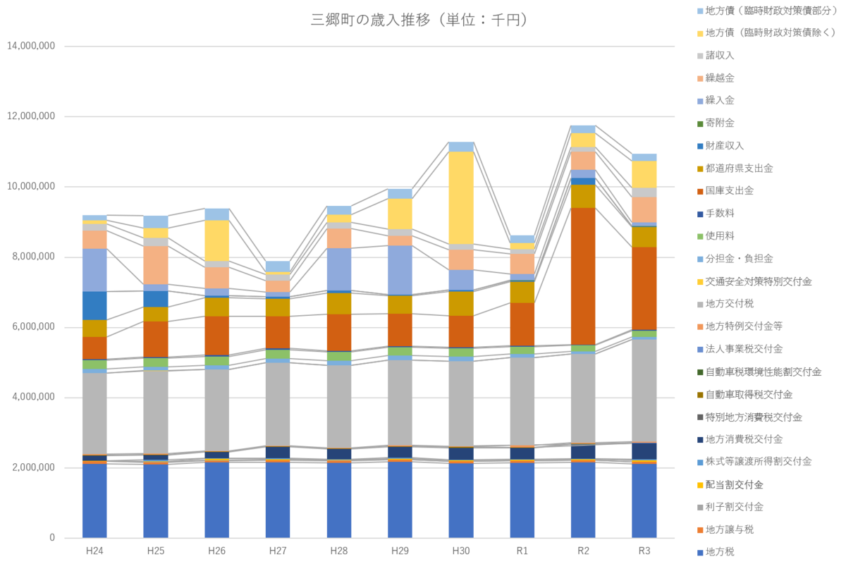 - 財政規模は100億円程度。年率2%で増加傾向にある。増加要因は高齢化に伴う医療・介護・福祉関係の費用増加など。土木費を抑制し、国からの交付金収入の増加により、これら費用を賄っていそう。