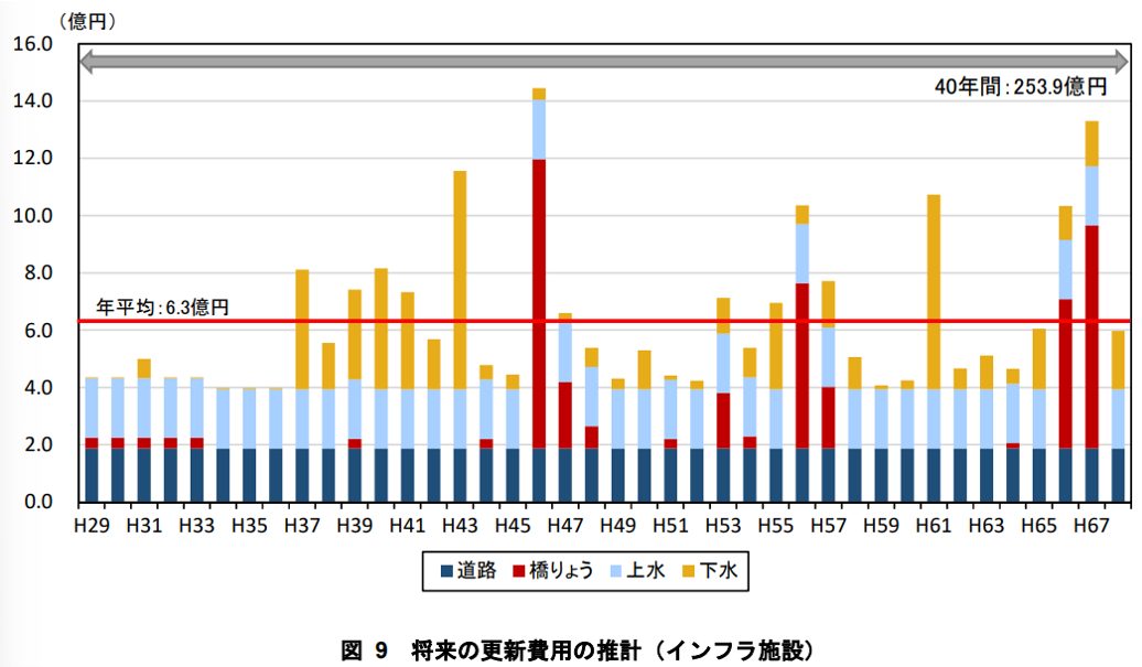 - 今後、社会インフラの更新費用で年平均16億円必要だが、現時点で社会インフラへの支出額は13億円で、収支が全くあっていない。高齢化の進展によりインフラ費に回せる額は減少が見込まれるので、大胆な取捨選択が必要になると予想される。
