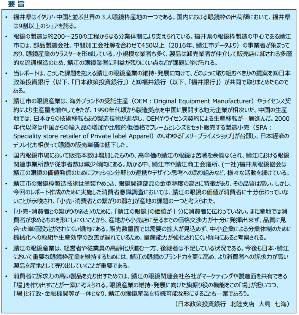 鯖江市には、450以上の事業者が集まって、眼鏡産業のクラスターを形成していますが、小規模事業者も多く、多層的な流通構造のため、事業者に利益が残りにくい構造となっているよう。中小企業の分業体制のため、機械化などの生産効率向上・量産能力強化がされにくい傾向にありそう。